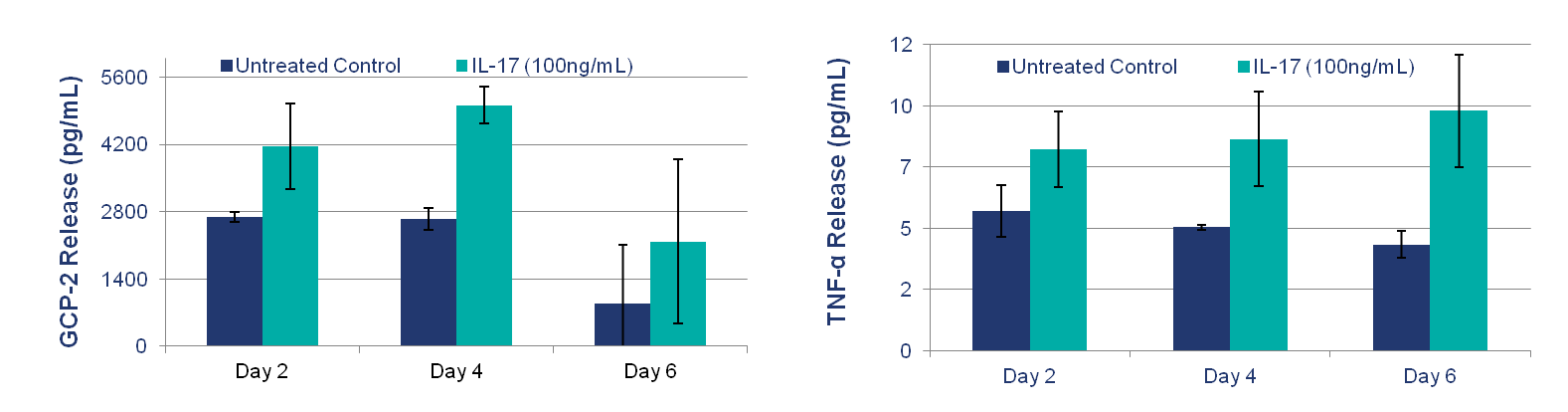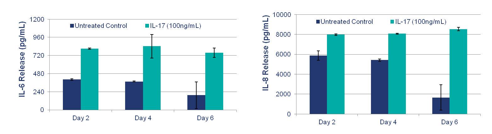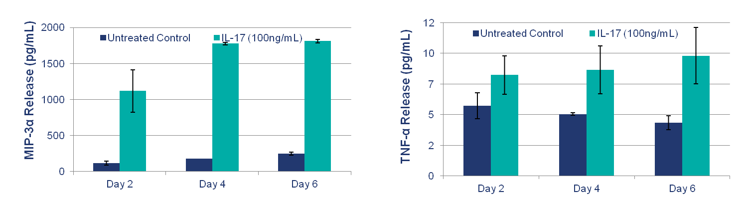 As increasing evidence implicates the TH17 pathway as playing an important role in the pathophysiology of Psoriasis, the effects of IL-17 were investigated on Mattek’s Psoriasis tissue model in a tightly controlled in vitro setting. Exogenous IL-17 induced the secretion of chemokines and cytokines that mediate chronic inflammation in Psoriasis including CCL20 (MIP-3α, Th17 and Dendritic Cell chemoattractant), IL-8 (Neutrophil chemoattractant) and IL-6 (Th17 Cell survival). These results demonstrate that IL-17 exacerbates inflammation in an in vitro human cell-based model of Psoriasis.