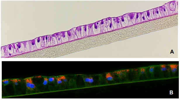 Figure 1. H&E-stained histological cross-section of the 3D human liver tissue model showing the hepatocyte polarization and stratification (A). Immunohistochemistry of albumin (orange) production is shown in (B). Tissues were grown on collagen coated underlying microporous membrane support (pore diameter= 0.4 um).
