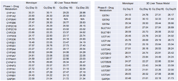 Changes in gene expression levels for drug metabolizing enzymes associated with first pass metabolism have also been assessed via qPCR over a period of 23 days. qPCR results demonstrate high level expression of enzymes involved in drug metabolism such as CYP2C8, CYP2C9, CYP2C18, CYP2C19, CYP2D6, CYP2E1, CYP3A4, CYP3A5, CYP3A7, and CYP4A11. Both Phase I and Phase II enzymes were expressed by the differentiated liver tissue model.